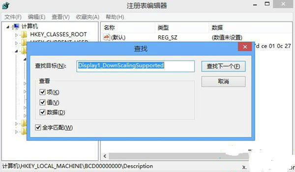 2、点击CTRL+F组合键出现查找框,在里面输进去Display1_DownScalingSupported进行查找,然后把键值修改成1,接着点击F3继续查找,然后将Display1_DownScalingSupported所有键值都要改成1。