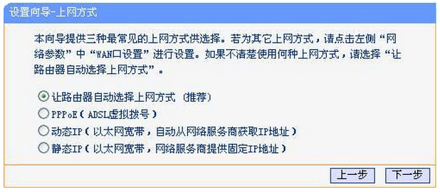 步骤二:点击“下一步”,弹出选择上网方式界面,可根据您所使用的宽带上网方式进行选择,如不清楚,可以选择“让路由器自动选择上网方式”,点击“下一步”。如下图示。