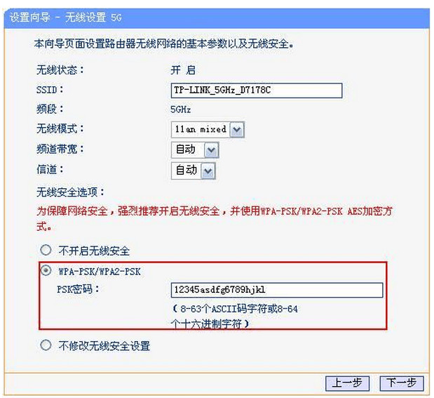 步骤五:点击“下一步”,弹出无线设置5GHz频段无线参数的界面,设置SSID、无线信道、无线安全等选项,无线安全选项推荐“WPA-PSK/WPA2-PSK”,如下图示。