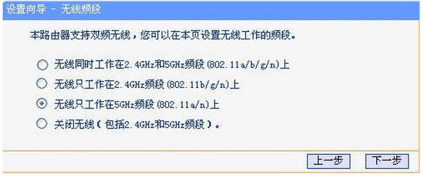 步骤四:点击“下一步”弹出无线频段设置界面。使用5GHz频段,可以选择同时开启2.4GHz和5GHz或者只开启5GHz,此例以只开启5GHz为例,选择“无线只工作在5GHz频段”,如下图示。