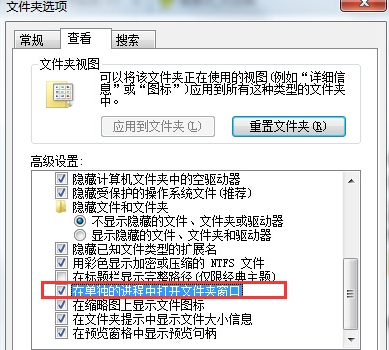 2.将鼠标移动到下方的高级设置中,在下面的列表中找到“在单独的进程中打开文件夹窗口”选项,然后将它勾选上,点击下方的确定按钮保存设置即可。