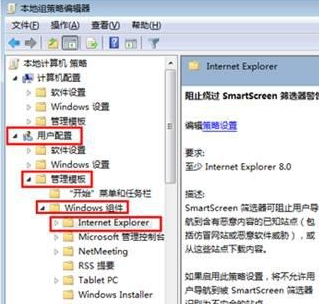 2.在打开的组策略编辑器窗口中,咱们左侧的菜单中依次展开“用户配置”—“管理模块”—“windows组件”—“internet explorer”,这里的internet explorer就代表的是浏览器了。