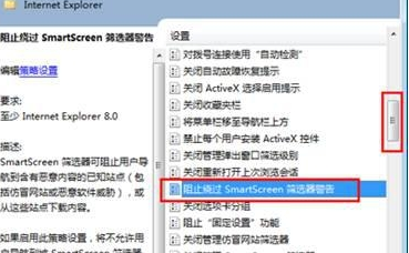 3.接下来,咱们在右侧的窗口中找到“阻止绕过smartscreen筛选器警告”选项并双击,然后在弹出来的窗口中将默认状况修改为“已禁用”,点击下方的确定保存设置即可。