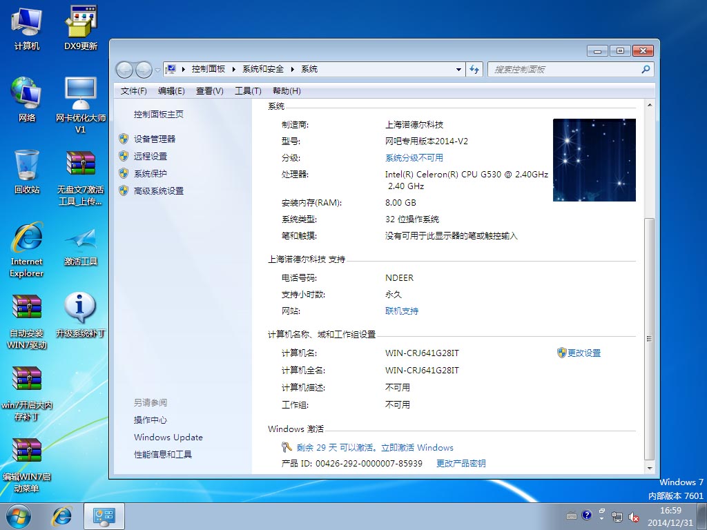 *整合系统补丁至2014年12月,重要更新已全部整合,无需再使用360或WINDOWS UPDATE升级补丁。