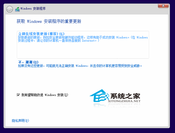 出现这个问题的原因是,在刚开始安装时出现“获取Windows安装程序的重要更新”窗口时,选择了“立即在线安装更新”。如图: