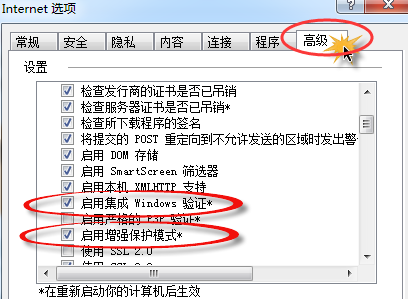 3.接下来咱们再次将界面切换到最后的高级这一项,然后在下方的列表中拉动右侧的拉动条,找到“启用集成windows验证”、“启用增强保护模式”这两项,将它们分别勾选上,最后点击下方的确定按钮保存设置即可。