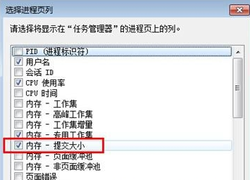 2.接下来就会弹出另一个窗口,如下图中所示,咱们在下方的列表中将“内存—提交大小”勾选上,点击下方的确定保存设置。