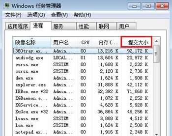 3.咱们重新返回到任务管理器窗口中,然后看下方列表中的项,会发现后面出现了提交大小这一列,而这列表示的便是各运行软件所使用的虚拟内存了。