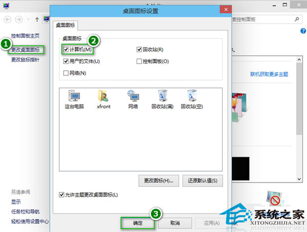 2.点击“桌面图标”,勾选“计算机”,点击确定按钮即可。