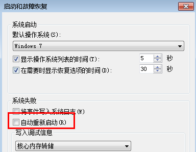 3.接下来就会弹出 如下图中所示的启动和故障恢复窗口,将系统失败下的“自动重新启动”选项取消勾选,最后点击确定保存设置即可。