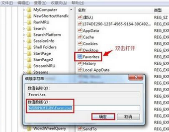 2.在注册表编辑器窗口的左侧,咱们可以看到一串很长的菜单栏,咱们在该菜单栏中依次展开HKEY_CURRENT_USER/Software/Microsoft/Windows/CurrentVersion/Explorer/UserShell Folders,接下来在右侧窗口中找到favorite选项并双击,这样就可以打开该项的编辑字符串窗口了,咱们在窗口中的数值数据这一栏中将默认值修改为%USERPROFILE%FAVORITES并单击确定保存即可。