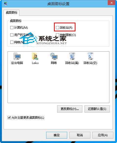 3.在桌面图标设置中,取消勾选回收站。