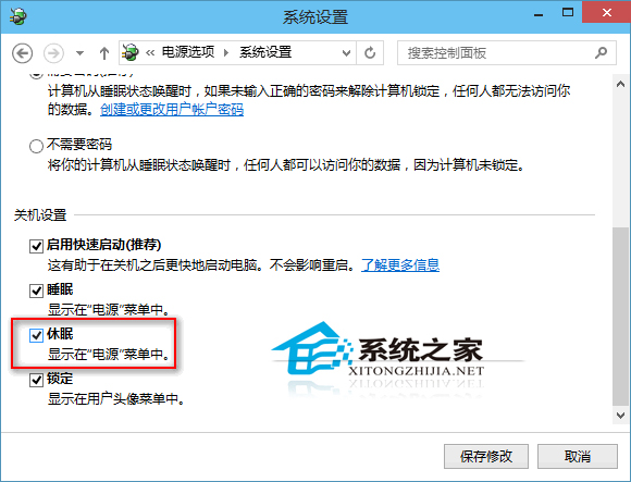 勾选“休眠”选项,最后点击“保存修改”按钮。