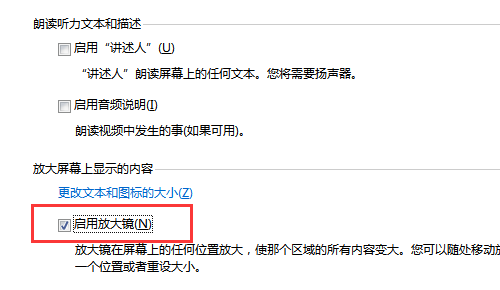 3.之后会弹出来一个设置界面,咱们直接拉动到窗口的下方,会看到一个“启动放大镜”选项,咱们直接将该项勾选上,最后点击下方的确定按钮保存设置即可。