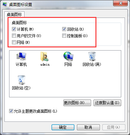 二、接着在个性化设置窗口中,点击左侧的“更改桌面图标”,选中需要显示的桌面图标,然后点击“确定”即可。如下图所示: