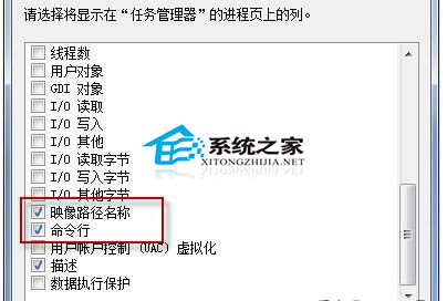 2、找到里面的“镜像路径名称”以及“命令行”这两项,并勾选它们就可以了。如图:
