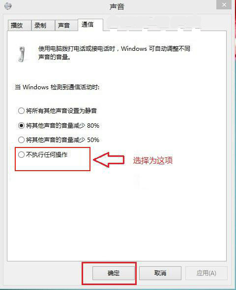 2、这时候就打开“声音”属性设置的对话框,直接选择“通信”选项,找到“当Windows检测到通信活动时”并在其下面直接选中“不执行任何操作”选项,之后单击“确定”按钮,如图: