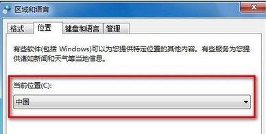 3.之后弹出区域和语言的设置窗口,咱们将界面切换到位置这一栏,然后下面的当前位置就可以供我们操作更改了,大家想设置到哪个位置就直接在这里选择就是了。设置好之后记得点击下方的确定按钮保存哦。