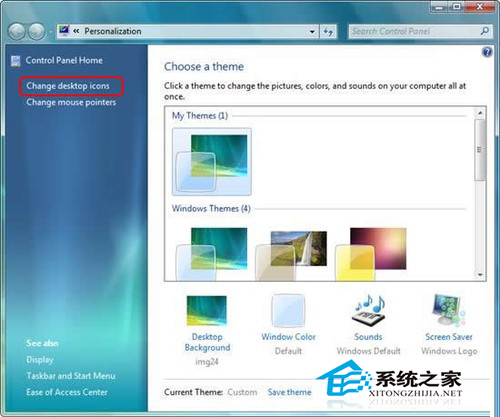4.在个性化窗口左列表点击“更换桌面图标”,弹出新对话框显示桌面图标。选定要更改的图标,并点击“更换图标”。新窗口弹出,选择喜欢的.ico文件来更改。
