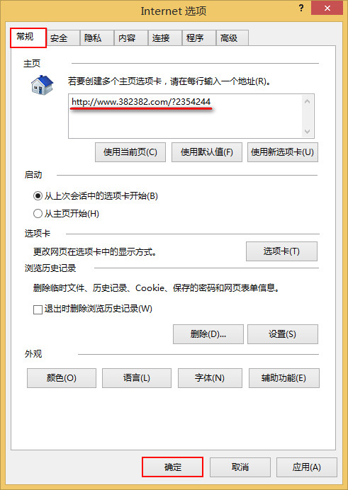 2、进入Internet选项后,选取“常规”页面,在主页框输入想要设置的网址,如果想要将当前网址设定成主页,直接点击“使用当前页”即可,完成后按下“确定”按钮,如下图所示: