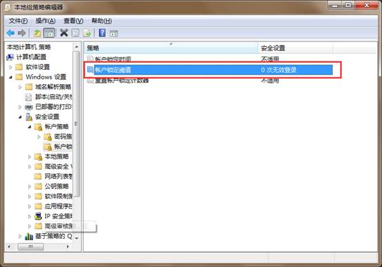 2.在打开的本地组策略编辑器窗口中,依次展开“计算机配置”-“windows设置”-“安全设置”-“账户策略”-“账户锁定策略”并且找到“帐户锁定阈值”如下图所示