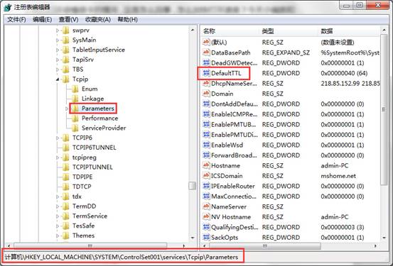 HKEY_LOCAL_MACHINE→SYSTEM→CurrentControlSet→Services→Tcpip→Parameters,找到DefaultTTL。如下图所示: