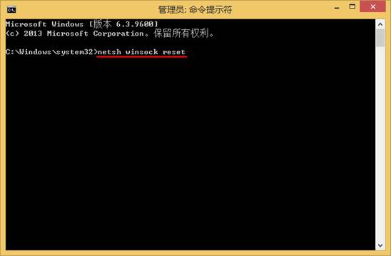 2、在弹出的命令提示符窗口中输入“netsh winsock reset”,如下图所示: