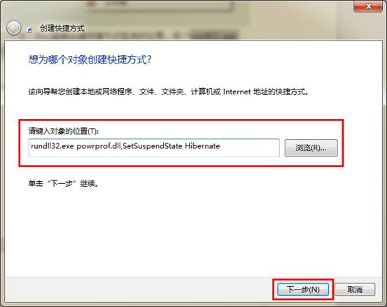 二、接着在弹出的窗口中键入我们需要创建快捷方式程序的位置,将“rundll32.exe powrprof.dll,SetSuspendState Hibernate”输入,点击下一步。如下图所示: