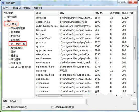 2、接着就会弹出一个系统信息的窗口,将下列的选项“系统摘要—软件环境—正在运行任务”依次展开,然后就能够在右边的框里面显示出来目前系统正在运行的全部程序的有关信息了,包括程序的优先顺序和最小工作集等等,是不是非常的简单呢?