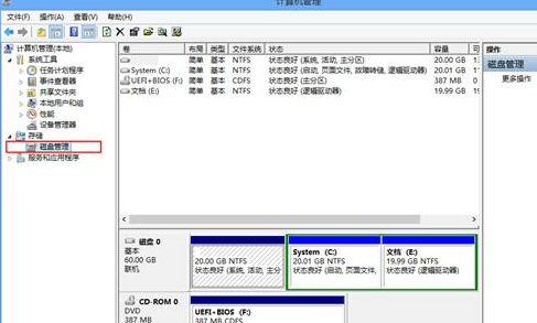 2.在弹出来的计算机管理界面中,咱们点击左侧菜单中的存储-磁盘管理,这样就可以在右侧窗口中看到现有的磁盘分布情况了,其中包括磁盘的文件系统以及内存大小。