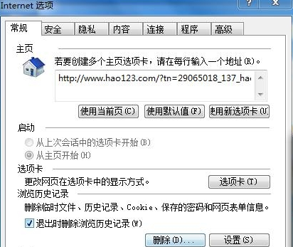 2.在打开的Internet选项窗口中,咱们将界面切换到常规这一栏中,咱们勾选上下方的“退出时删除浏览历史记录“,然后点击删除按钮,将当前所有的历史文件全部清空掉。