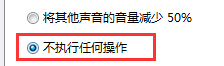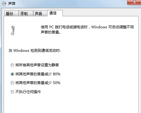 2.咱们将界面切换到通信这一栏,如下图中所示,小编预装的win7系统中将设置默认为:将其他声音的音量减少80%。也就是说当有声音的程序窗口弹出时,我播放的音乐声音将被减少80%,这也就是为什么大家在看电影的时候发现有QQ消息声音弹出,电影的声音则会出现降低的原因。