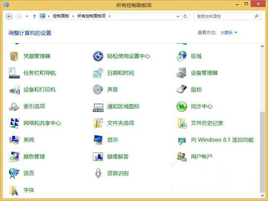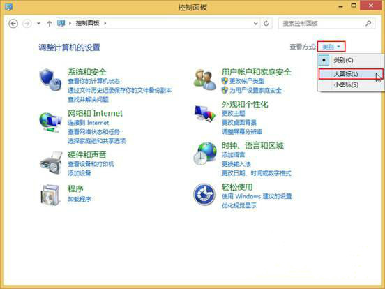 2、控制面板打开之后,把气右上方的查看方式直接改为“大图标”模式;