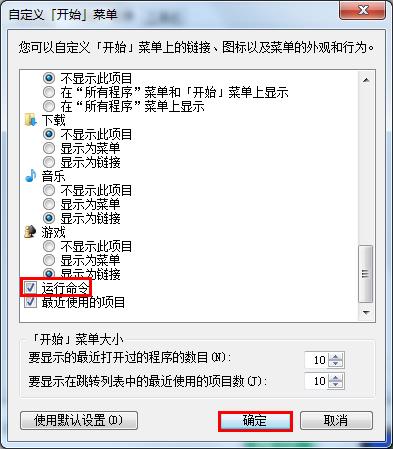 3、打开自定义开始菜单窗口后,在下拉框中找到并勾选“运行命令”选项,点击“确定”按钮保存修改即可,如下图所示: