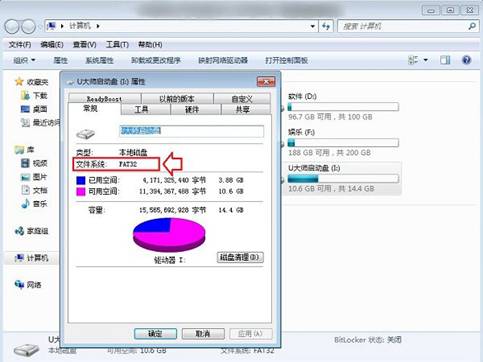 想要解决此类问题,首先,用户需要核实一下这个盘符的格式情况,看是否是因为这方面的问题导致。此时可以将鼠标移至这个盘符的图标上面,单击鼠标右健后会出现一列菜单,在这个菜单中找到‘属性’,此时用户会看到,这个盘符是一个FAT32的格式,可以看出这样的盘符运行确实会比较慢,应该更新为最新的NTFS格式会更好用。