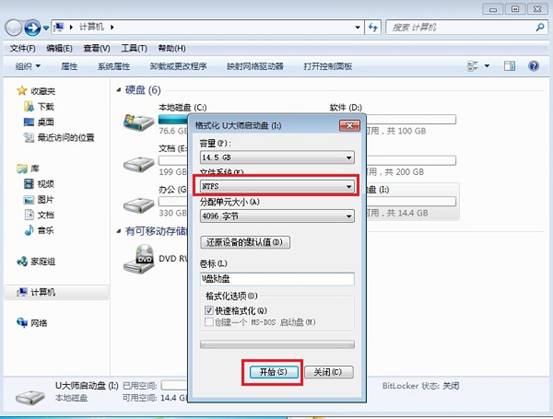当用户将这个U盘中的文件全部备份之后,接下来用户就可以对这个盘符的系统进行更新的操作。同样也是在这个盘符的图标上,单击鼠标右健,在出现的列表中找到‘格式化’,单击鼠标选择这一项,这个时候系统会出现一个格式化的页面,用户此时只需要将中间一个选项‘文件系统’进行更改。用鼠标单击下拉选项,在这个里面找到NTFS之后选中。然后再用鼠标单击页面最下方的‘开始’。