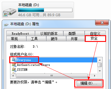 6、此时,如果访问共享提示没有权限,那么你需要在你需要共享的分区上添加Everyone权限,如下图: