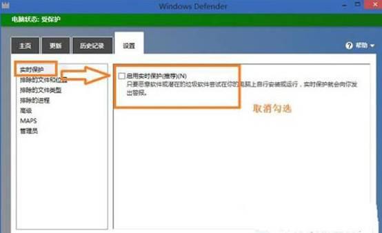 2、弹出“windows defender”服务窗口后,点击“设置”切进页面,点选“实时保护”一项,把“启用实时保护(推荐)”复选框的勾选取消掉,之后点“确定”储存设置就好了。