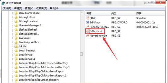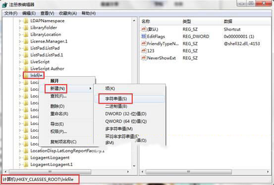 然后依次打开HKEY_CLASSES_ROOT→lnkfile,右键 lnkfile 新建→字符串值”命名为“IsShortcut”