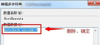 3.在打开的编辑多字符串窗口中,咱们将系统默认的设置autocheck autochk删除掉,然后点击窗口下方的确定按钮保存设置即可。