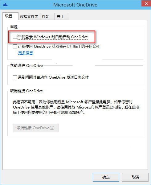 默认显示的是“设置”选项卡,取消勾选“当我登录Windows时自动启动OneDrive”选项,确定,即可禁止OneDrive开机自动启动。