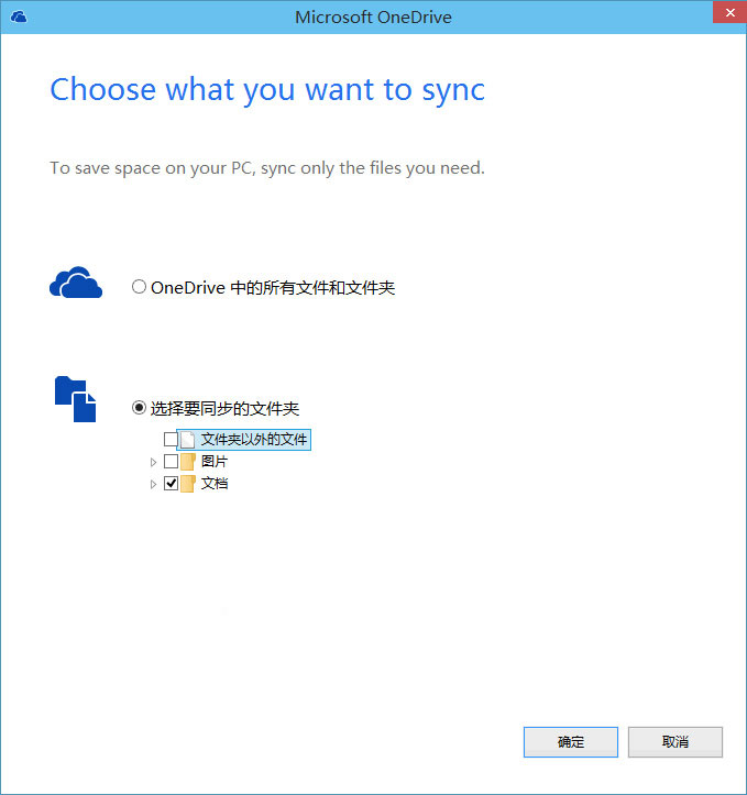 默认选中的是“OneDrive中所有的文件和文件夹”,修改成选中下面的“选择要同步的文件夹”,然后取消勾选你不想同步的文件夹即可。