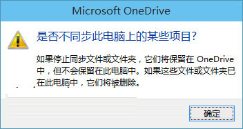 建议取消“文件夹以外的文件”和“图片”文件夹,因为这些文件夹比较占用空间,相对来说“文档”占用空间就小一些。当你取消勾时,会弹出“是否不同步此电脑上的某些项目”提示窗口。如图: