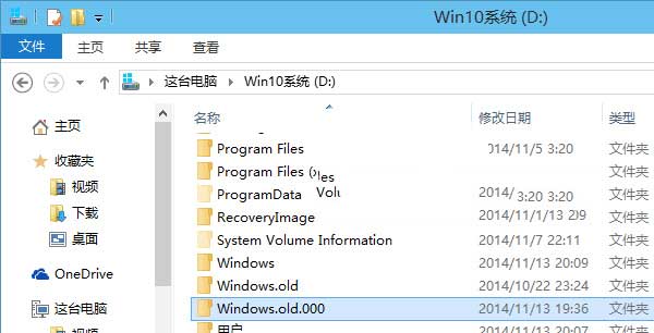 现在又从Win10预览版Build9860升级安装了Build9879,那么之前的Win10 Build9860系统文件就不能再保存成名为Windows.old的文件夹了,所以就保存成了名为Windows.old.000的文件夹。如图: