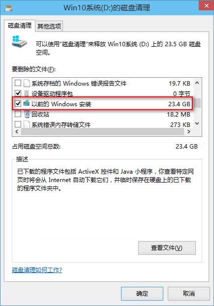 艾薇百科在对Win10系统盘进行磁盘清理扫描后,扫描出的“以前的Windows安装”项目高达惊人的23.4GB,大小正好相当于两个Windows.old文件夹加在一起。如图: