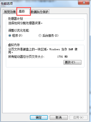 4、往出现的“性能选项”面板切进“高级”页面里;