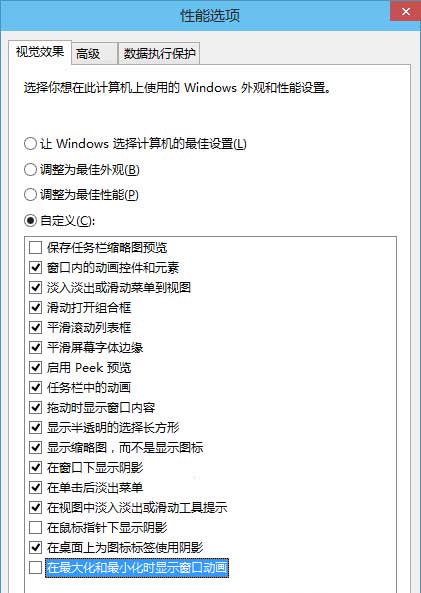 选中“自定义”,然后在下面的列表的底部取消勾选“在最大化和最小化时显示窗口动画”选项,最后点击“应用”或“确定”关闭窗口。