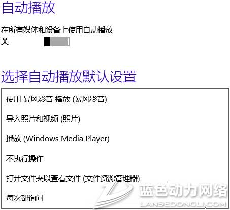 进入Windows 10“电脑设置”(不知道怎样打开的请看:怎样打开Windows 10的“电脑设置”?),选择“电脑和设备”,继续选择“自动播放”,“自动播放”设置界面如图: