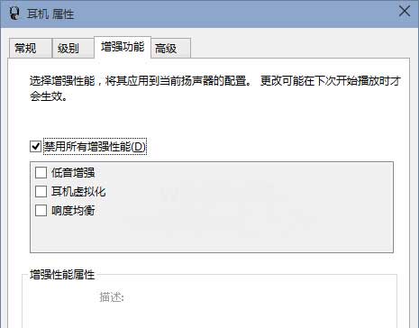 勾选“禁用所有增强性能”,最后确定关闭窗口。然后再试试,以前没有声音的应用应该就能发声了。