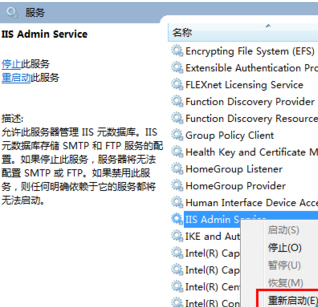 3、选中其中的IIS Admin Service选项, 然后点击右键,就可以在下滑菜单中看到重新启动这个选项了,直接单击重新启动就可以了。